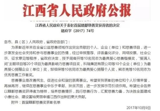 江西省政府发文表彰“首届赣鄱慈善奖”获得者