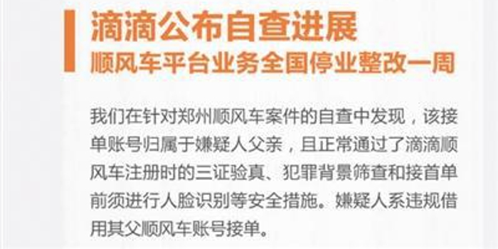 公告中称,滴滴公司在针对郑州顺风车案件的自查中发现,该接单账号归属于嫌疑人父亲,且正常通过了滴滴顺风车注册时的三证验真、犯罪背景筛查和接首单前须进行人脸识别等安全措施。嫌疑人系违规借用其父顺风车账号接单。