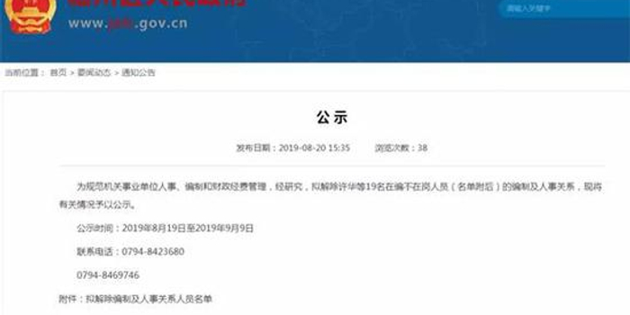 为规范机关事业单位人事、编制和财政经费管理,经研究,拟解除许华等19名在编不在岗人员(名单附后)的编制及人事关系,现将有关情况予以公示。