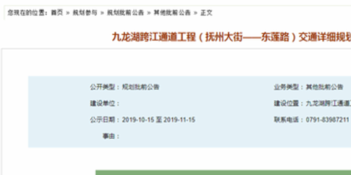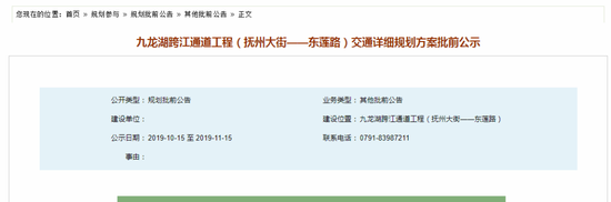 摘要: 10月15日,南昌市自然资源局公示了,九龙湖跨江通道工程(抚州大街——东莲路)交通详细规划方案。10月15日