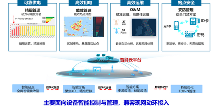 二是打造机房能耗智慧管理平台,通过大数据建立能耗模型,实现机房用电精细管理。基站能耗智慧管理平台针对各种用电应用场景,智能制定最优供电策略,通过一体化能源柜、智能空开“硬关断”等自动控制设备运行时间,实现机房节能效率提升20%。通过大数据分析,建立基站能耗模型,能及时查找基站能耗异常点,并输出分析报告和整改方案,提升了机房用电管理精准度,为开展节能改造、能效评估和站点方案建设等提供了可靠的数据依据。