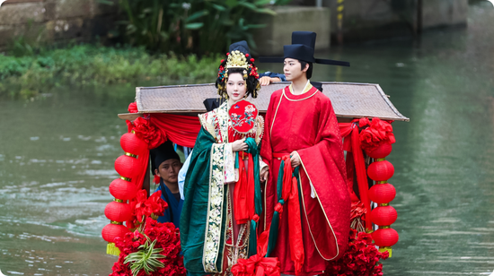 临水登船、桥岸抛花,宋式浪漫再现小镇,见证一场从千年前穿越而来的盛大婚礼。
