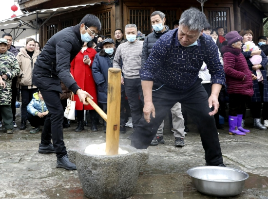 “打麻糍喽……”随着一声欢呼,精彩的打麻糍大赛上演了!一人使用木锤大力的对糯米进行敲打,间歇中,另一个人把控糯米团的转向,以便全方位的打到糯米,俩人通力合作,配合到位。随着木锤锤打石臼发出的“嗵嗵”声,麻糍已成型,现场香味四溢,众多游客争先恐后地围上来,乐呵呵地等着品尝麻糍。