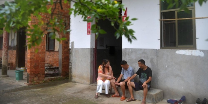 在江西省南昌市南昌县三江镇松林村,徐美花和王家兄弟在家门口乘凉聊天(6月18日摄)。
