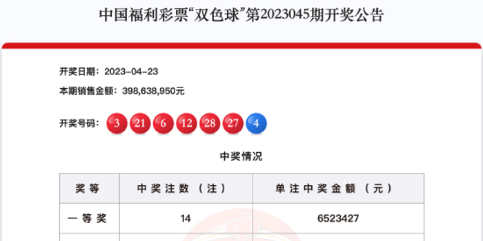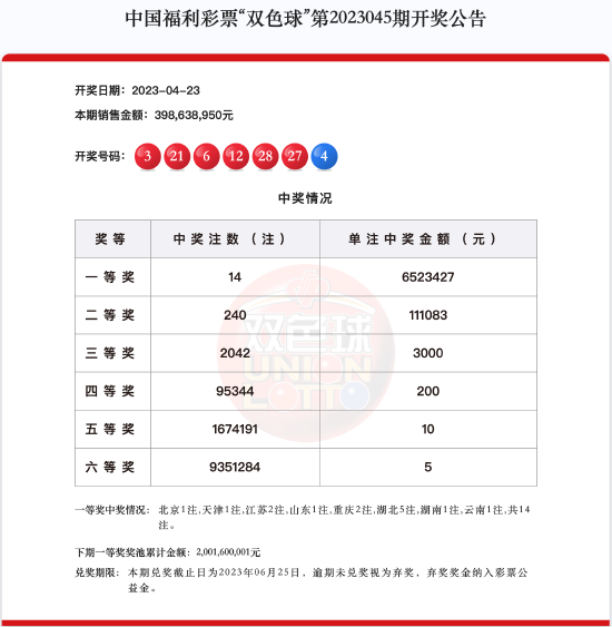 当期全国销量为3.98亿多元。计奖后,双色球奖池金额为20.01亿多元。下期,彩民朋友依然有机会2元中得1000万。