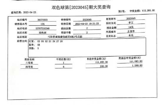 第3注出自上饶市弋阳县36070223号投注站,中奖彩票为一张14元7+1复式票,喜中1注二等奖,6注四等奖,奖金共计112283元。