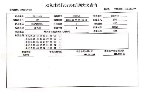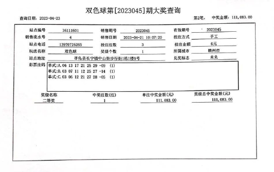 第1注出自赣州市上犹县36111421号投注站,中奖彩票为一张10元单式票,喜中1注二等奖,奖金共计111083元。