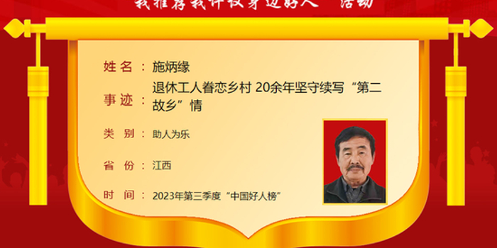 施炳缘,男,1951年6月生,江西省吉安市吉安县敖城镇湖陂村村民。他出生在上海,却把一腔热情洒在江西乡村。1970年,他响应国家号召,在吉安县前岭湖陂大队工作3年,从此与这片红土地结下不解之缘。2002年退休后,他从上海返回吉安县助力乡村建设,这一待就是21年。在村内办书画班,帮助孩子们练习书画,免费教村民识字。。。。。。他如一棵大树般扎根乡村,用自己的努力和汗水让乡村大变样,用自己的真诚和善良赢得了乡亲们的尊敬。获“江西好人”等荣誉称号。
