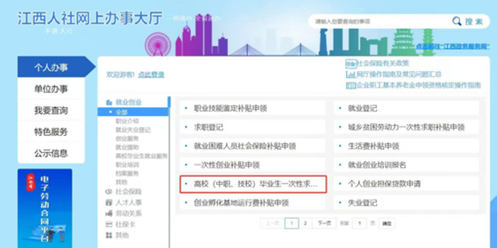 进入江西省人力资源和社会保障厅官方网站“江西人社网上办事大厅”(https://zwfw.rst.jiangxi.gov.cn/jxrsdt/index.html)→个人办事→就业创业→全部→高校(中职、技校)毕业生一次性求职创业补贴申领→网上办理。