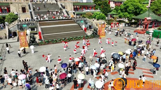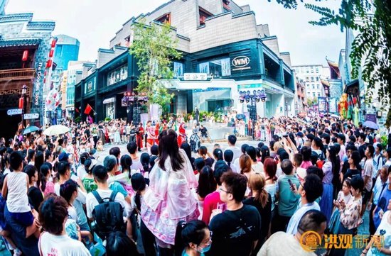 随着开场鼓声响起,李霞带着女儿跟着人群走进“古代洪州城”——酒旗招展、商贩叫卖、文人吟诗,沉浸式场景引人入胜。“刚才投壶我还中了三支箭,‘掌柜’给了我一小包桂花糕当奖品,孩子特别开心。”李霞笑着说,比起坐在台下看演出,这种“边走边玩、随时互动”的体验更有意思。