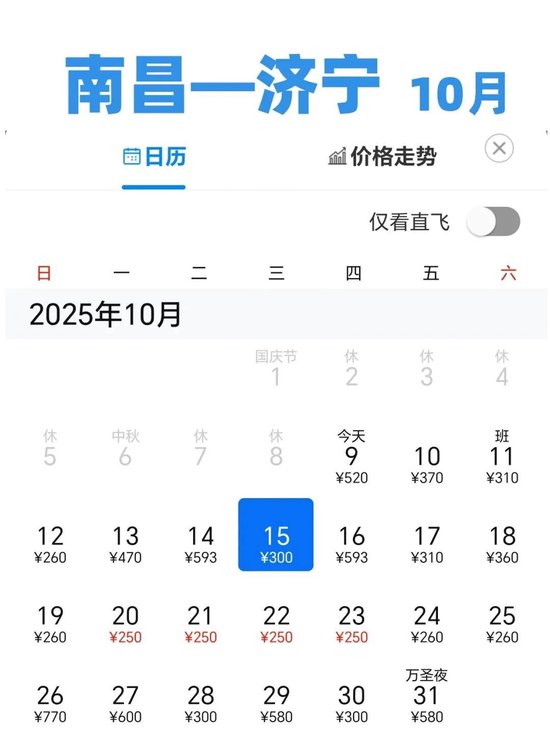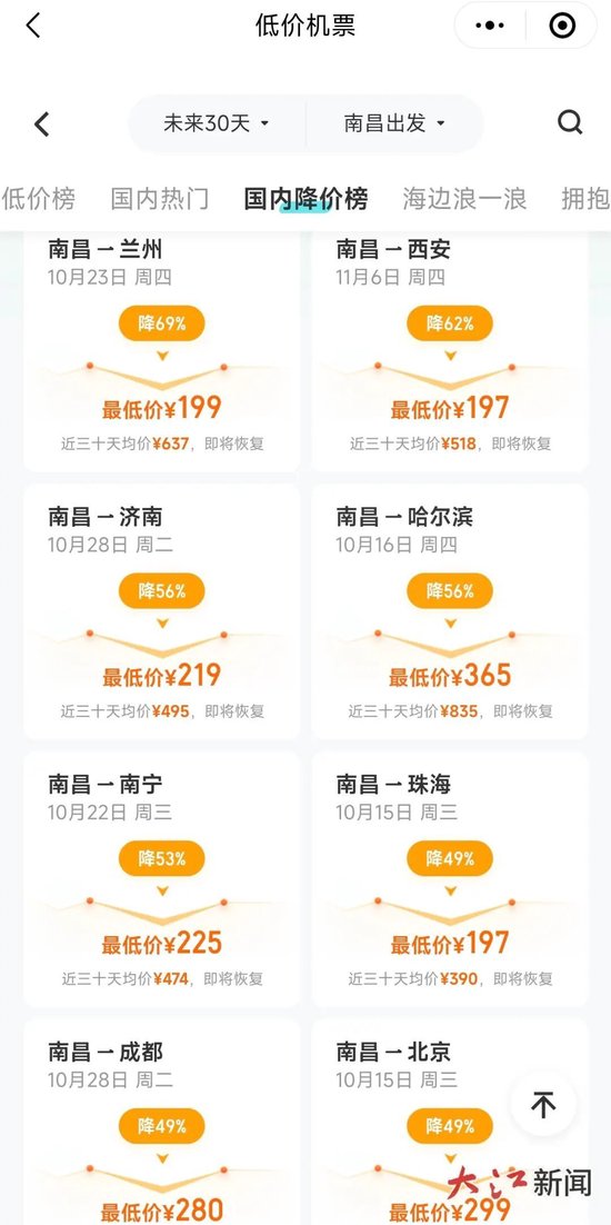 关注今年国庆、中秋假期叠加,旅客出行热情高涨,旅游度假、探亲访友等出行需求旺盛,随着国庆假期结束,部分航线票价已逐步回落,记者查询第三方售票平台看到,从南昌出发的机票价格低至200元左右,可飞全国多地,有需求的市民可选择错峰出行。