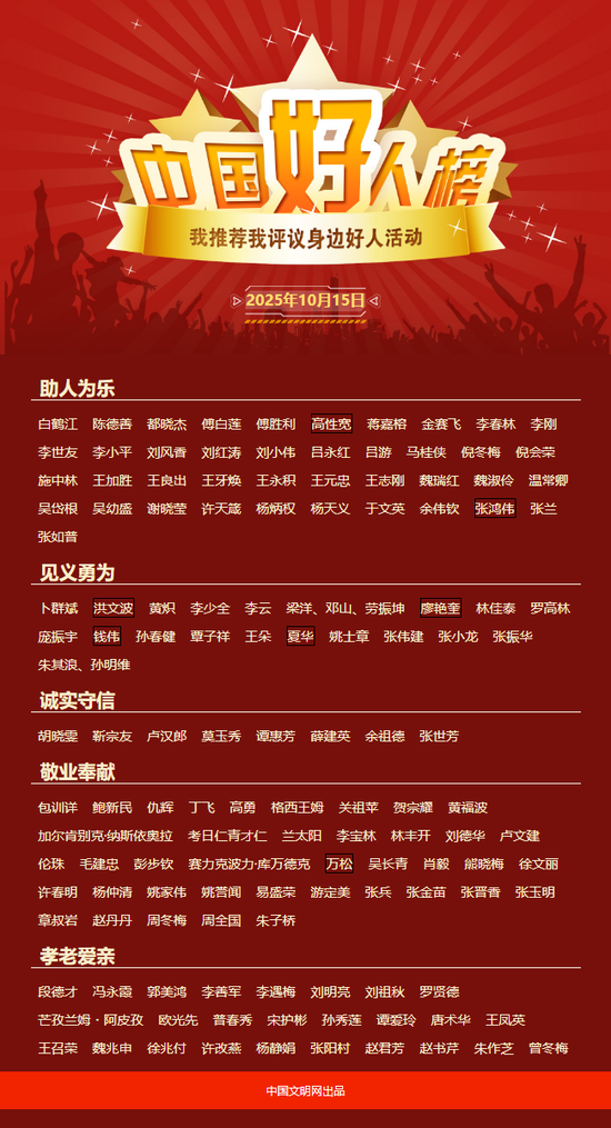 关注2025年第三次“中国好人榜”发布仪式暨全国道德模范与身边好人现场交流活动10月15日在新疆维吾尔自治区阿克苏地区举办。经各地推荐、网友评议和专家评审等环节,共有138名助人为乐、见义勇为、诚实守信、敬业奉献、孝老爱亲身边好人光荣上榜。