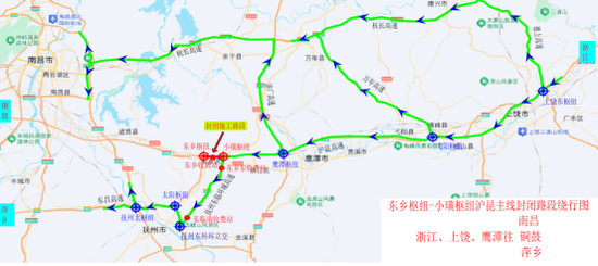 鹰潭通往萍乡、铜鼓方向车辆:沪昆高速→小璜枢纽→抚州东临环城高速→抚州东外环立交→抚州东外环→太阳枢纽→东昌高速→抚州北枢纽→福银高速通往萍乡、铜鼓、南昌。
