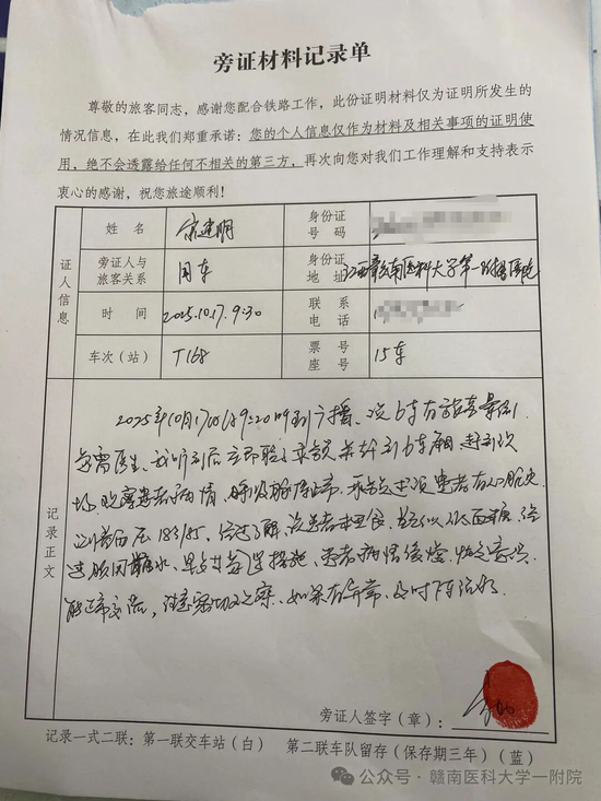 列车即将抵达石家庄站宋建明再三叮嘱老人“若有不适,务必及时告知邻座或乘务员。”同时提醒乘务员密切关注老人情况,异常时立即安排下车就医。随后他认真填写列车旁证材料记录单后才匆匆拎起行李下车。