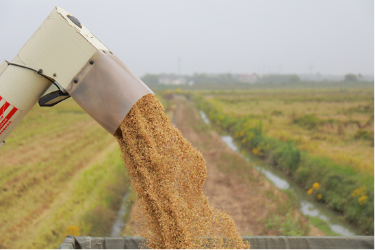 “你看这个谷粒多漂亮,今年又是一个丰收年!”在彭泽县芙蓉农场种植大户房云旺的万亩稻田里,数台收割机正开足马力来回穿梭,伴随着机器的轰鸣声,一排排金灿灿的水稻被吞入机腹,粉碎的秸秆从机尾均匀排出,饱满的谷粒则颗粒归仓。