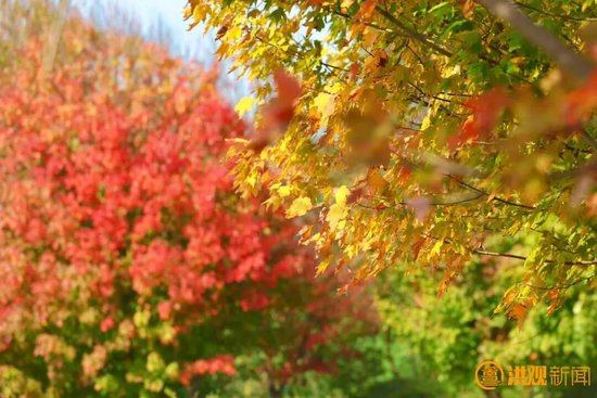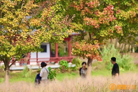 枫叶在秋风中摇曳生姿与园区内的粉黛乱子草共同勾勒出斑斓的秋日画卷。