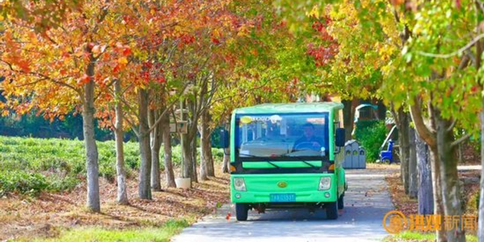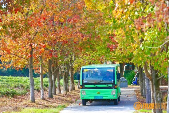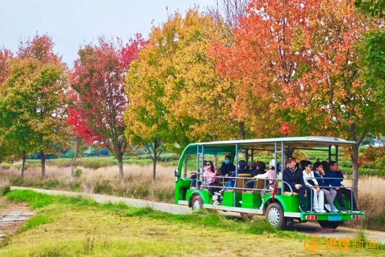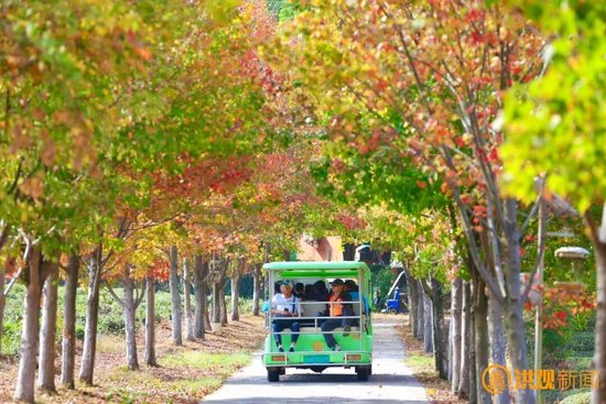 游客们或乘观光车穿梭于枫林间或漫步在草甸上沉浸式感受秋的韵味。