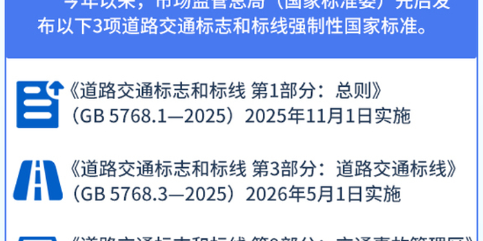 今年以来,市场监管总局(国家标准委)先后修订发布《道路交通标志和标线 第1部分:总则》《道路交通标志和标线 第3部分:道路交通标线》和《道路交通标志和标线 第9部分:交通事故管理区》3项强制性国家标准。