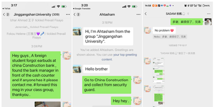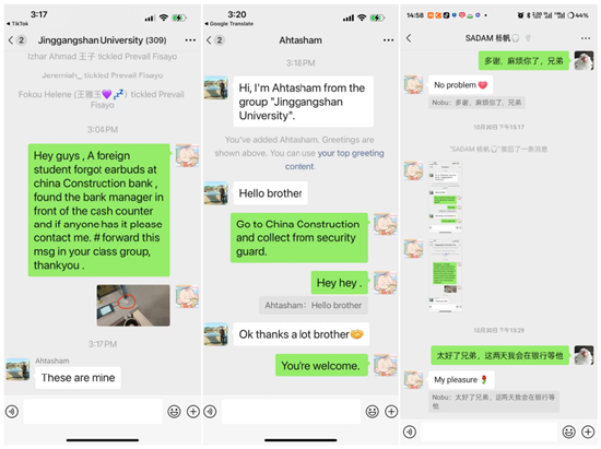 杨帆是两年前来到井冈山大学留学的,有时会来该行办理业务。该行大堂经理与其熟络之后,杨帆时常通过微信向该行大堂经理咨询各类问题。通过微信联系,杨帆确认耳机并非是自己的。随后,在与该行工作人员的沟通配合下,留学生杨帆在留学生群里发布了失物招领信息,帮助寻找失主。一条失物招领信息,开始在群里快速传递。