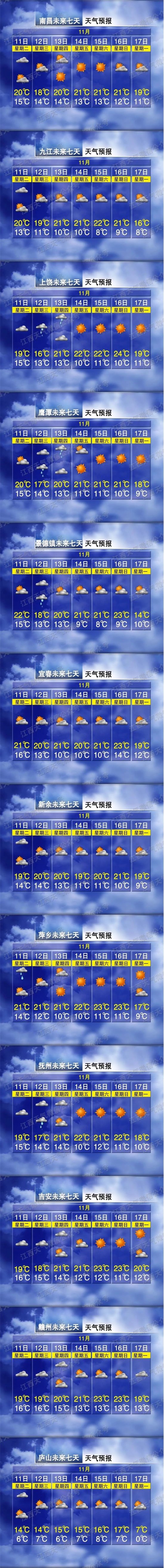 今天东部、南部多云转阴天有小雨全省其他地区多云。明天东部、南部阴有小雨其中赣东北部分地区有中到大雨全省其他地区多云间阴天。13日东部雨停转多云全省其他地区多云转晴。
