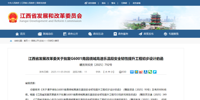 11月12日,从江西省发展和改革委员会获悉,该委日前下发《关于批复G6001南昌绕城高速乐温段安全韧性提升工程初步设计的函》,同意G6001南昌绕城高速乐温段安全韧性提升工程的建设。