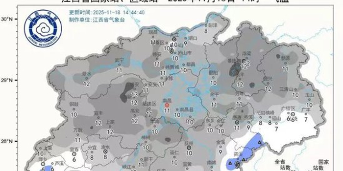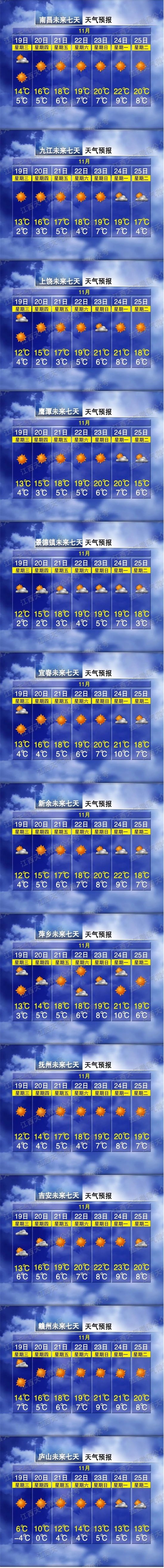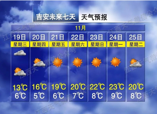 和前天同期相比,除了更早一些开启降温进程的赣北北部以外全省大部分地方的降温幅度都达到了7°C~14°C,瑞金和石城甚至还下降了17°C以上,体感上仿佛一夜之间转换了季节预计今天寒潮的影响还将持续,赣北晴天间多云。赣中、赣南多云转晴早晨全省的最低气温可能会下降到2°C~5°C赣北、赣中局部山区可达0°C以下。提醒早起出门的朋友一定要注意做好保暖工作外出记得戴好帽子、围巾。到了明天,全省都会是晴天间多云的天气有阳光相伴气温也将逐步回升。以吉安为例今日最高温仅有13°C,24日最高温将达到23°C