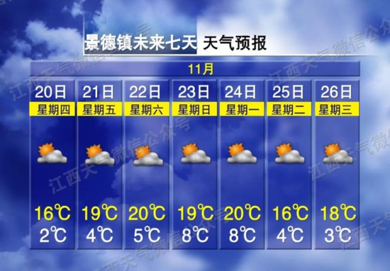 预计未来几天全省大部分地区,都将以晴朗天气为主气温也会缓慢回升。非常适宜洗衣晾晒或开展一些户外活动。但需要注意的是,昼夜温差较大以景德镇为例,21日、22日连续两天温差达15°C。