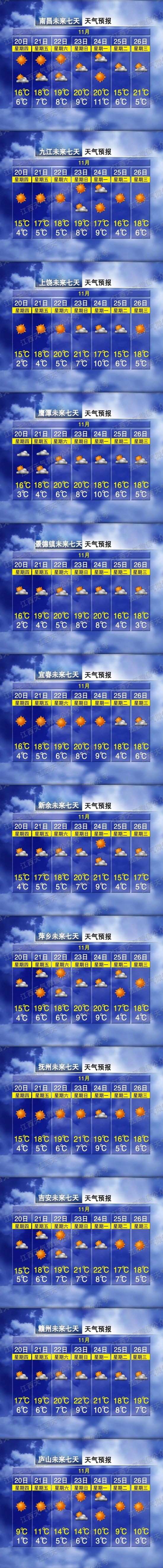 大家早晚外出时,要注意做好保暖工作,可参考洋葱式穿衣法,根据温度变化随时调整着装。另外本月末的24日和27日,地面有弱冷空气南下影响我省。届时气温将有所下降庐山25日最低温仅有0°C,提醒大家及时关注天气变化提前做好防范措施,