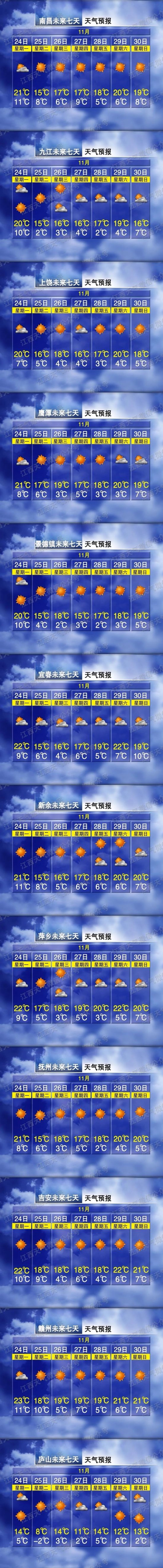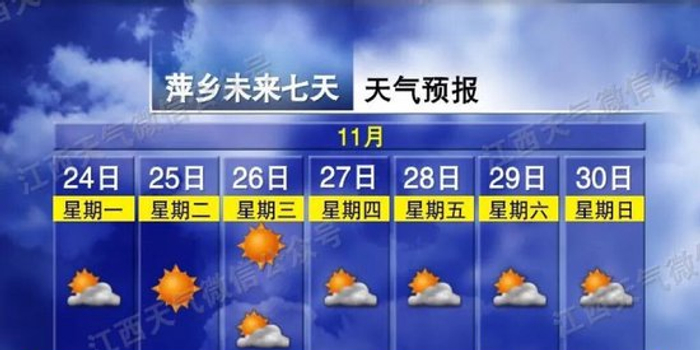 关注天气趋势,预计本周江西省以晴或多云天气为主,阳光在线,适宜户外活动和洗衣晾晒。不过冷空气活动频繁,先后会有两轮冷空气影响我省分别是在24~25日以及26日晚~27日其中今明2天,全省气温下降2~4度,偏北风力加大,3~4级江湖水面、河谷和高海拔山区阵风6~7级26日晚~27日。全省晴天间多云,气温略有下降偏北风力加大到3级,江湖水面、河谷和高海拔山区阵风5级,两轮冷空气对最低气温影响明显昼夜温差加大。以萍乡为例11月28日、11月29日早晚温差可达17℃。