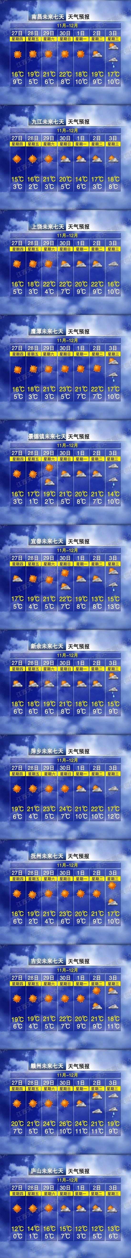 预计未来几天,江西全省基本维持晴朗的天气格局,今天,预计会有一股新的冷空气南下影响我省全省晴天间多云气温略有下降,但幅度不大此次冷空气带来的影响主要是风力的加大,偏北风在3~4级江湖水面、河谷和高海拔山区阵风6级左右。