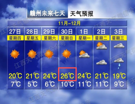 28日到30日白天,我们会迎来冷空气的间歇期全省以晴朗天气为主,气温将逐步回升最高气温基本都在20℃以上。其中,赣州30日的最高气温甚至会达到26℃。
