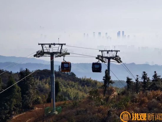 随着缆车缓缓攀升,云海在脚下流淌,洪城在远方铺展,泡桐、油茶、杉木等植被在脚下一览无余。整座梅岭都被深浅不一的绿色所覆盖。