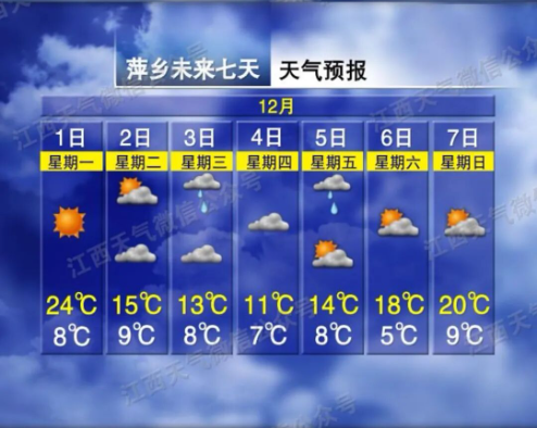 不过,此轮升温节奏即将被冷空气打断预计今天赣北北部受弱冷空气影响气温略有下降12月2日—3日再次受弱冷空气影响,全省气温均将有所下降同时偏北风力加大江湖水面、河谷和高海拔山区阵风6~7级以萍乡为例,今天最高气温为24℃,到下周四最高气温将降至11℃骤降13℃!