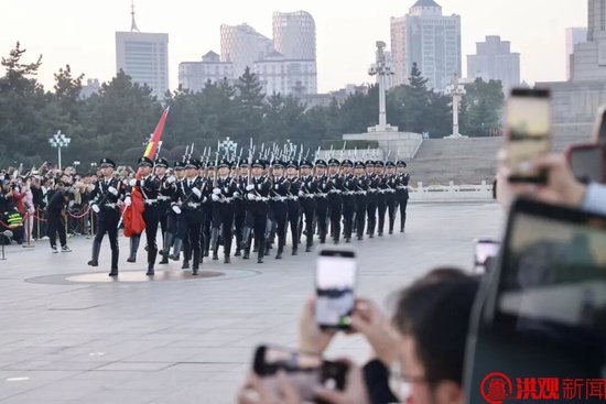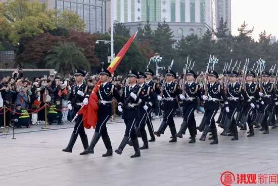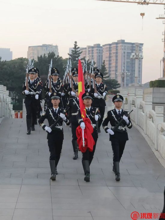 7时整,升旗仪式准时启动。激昂雄壮的《歌唱祖国》奏响在广场上空,由南昌市公安局警旗队52人组成的护旗方队,迈着整齐划一、坚定有力的步伐,从候场区出发,一路走过金水桥,来到八一南昌起义纪念塔下站定。