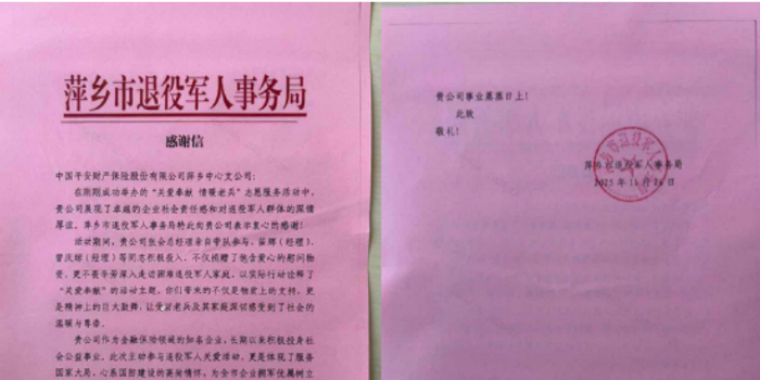 一面锦旗,承载着一份认可;一封感谢信,凝聚着一份信赖。此次获赠感谢信与锦旗,既是对平安产险萍乡中心支公司过往拥军优抚工作的总结与肯定,更是对未来工作的鞭策与期许。
