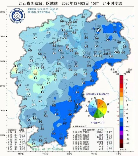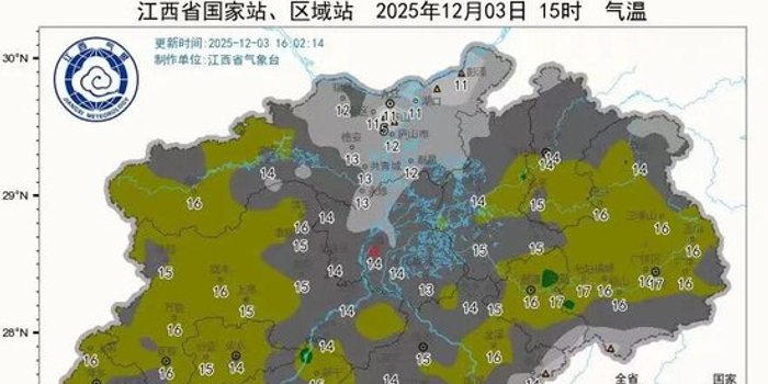 下午3点全省气温大多在14-17℃和昨天同期相比普遍下降了3~6℃,瑞金降幅更是达到了8℃之多。