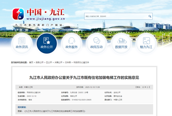 为适应社会发展和人口老龄化需求,完善既有住宅使用功能,方便居民生活,提升城市生活品质,根据《中华人民共和国民法典》《中华人民共和国建筑法》《中华人民共和国特种设备安全法》《江西省特种设备安全条例》等法律法规,结合我市实际,九江市人民政府办公室印发了《关于九江市既有住宅加装电梯工作的实施意见》。
