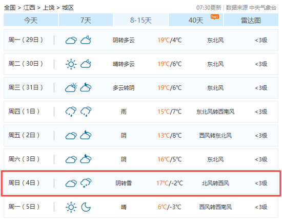 再来关注一下江西接下来的天气情况吧,-5℃!小雨!雨夹雪!江西下雪时间表来了受冷空气南下影响,这几天省内气温将下降4℃~6℃,偏北风力加大,江湖水面、河谷和高海拔山区阵风6级左右,全省自北向南将出现小雨天气,据中央气象台最新数据监测受新一轮冷空气影响,下周日(1月4日)九江最低气温将达到-5℃。