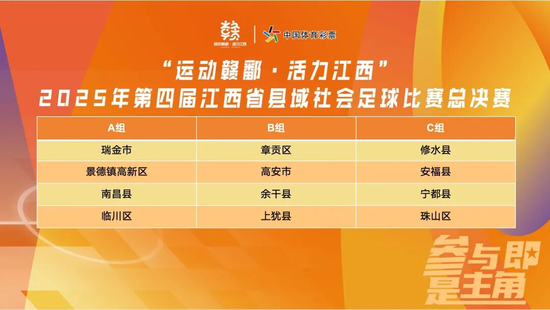 根据赛制安排,东道主瑞金市队直接晋级总决赛阶段,南昌县队、景德镇高新区队等11支球队凭借稳定发挥成功突围,共同组成总决赛阵容。本届总决赛12支球队分为A、B、C三个小组,各组对阵形势如下: