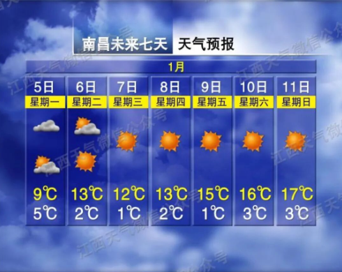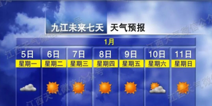 全省风力较大江湖水面、河谷和高海拔山区阵风6级左右6-14日全省以晴朗天气为主,其间还会有两次冷空气先后来袭分别在6-7日、12-13日冷空气影响期间全省气温会略有下降,风力加大早晚气温普遍较低。赣北赣中大部地方最低气温将在冰点上下。以九江为例6日开始最低气温将降至0℃左右尤其是7日最低气温更是低至-2℃。