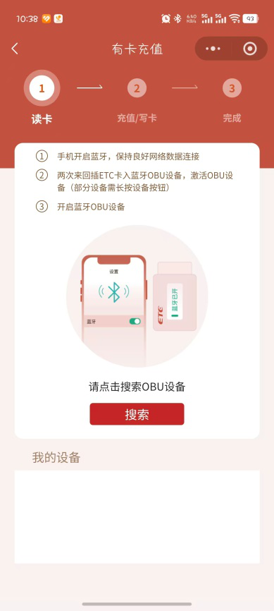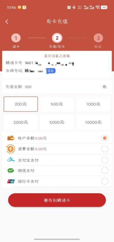 2、选择“有卡充值”,开启手机和ETC设备蓝牙,完成连接,输入充值金额并支付后等待圈存,直到提示“操作成功”。