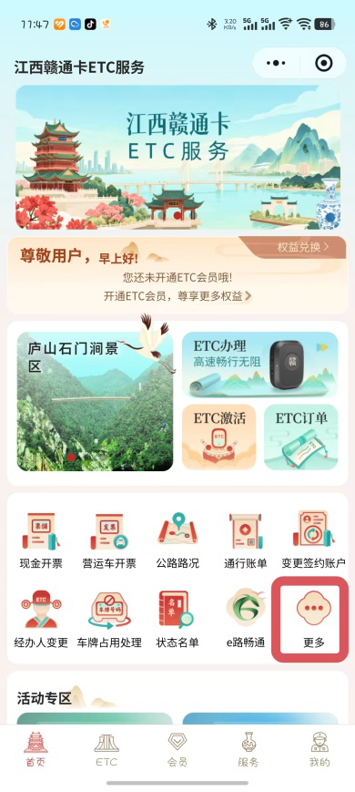 1、点击下方“江西赣通卡ETC服务”小程序,进入首页点击“更多”→“ETC充值”。