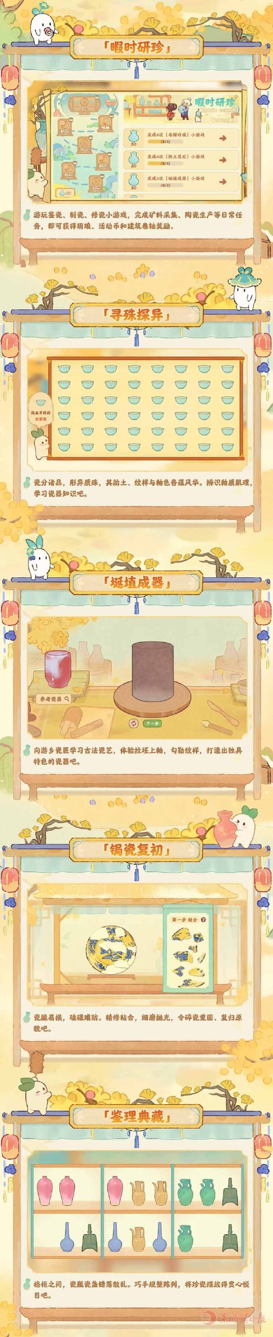 随着瓷器文化在桃源中发扬,更多与瓷器有关的小游戏也能帮助大家更进一步体验瓷的魅力:‘暇时研珍’带你了解瓷器的制作、鉴赏,‘寻殊探异’教你品鉴瓷器、辨认诸品,‘埏埴成器’助你手把手打造瓷器,‘锔瓷复初’让你见证破损瓷器如何修复……