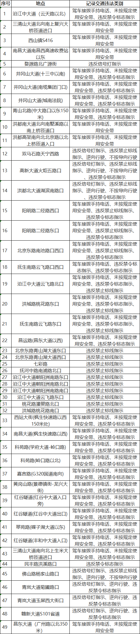 根据道路交通安全管理需要,按照《中华人民共和国行政处罚法》《中华人民共和国道路交通安全法》等法律法规有关要求,拟对49处已建的交通技术监控设备新增违法行为向社会公布,请广大交通参与者自觉遵守道路交通安全法律法规。