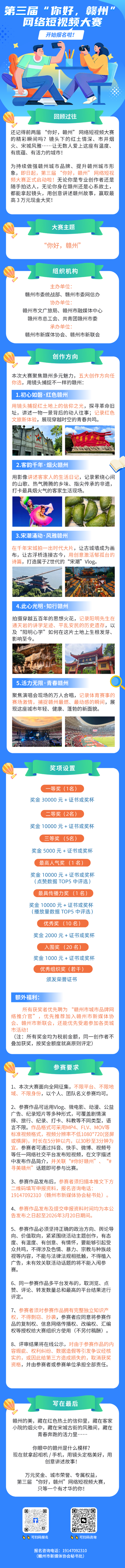现在,我们邀请你拿起镜头,参加第三届“你好,赣州”网络短视频大赛!我们期待你捕捉:永州送给赣州老表的“友谊之墙”,红色赣州与热情永州的双向奔赴,以及苏湘赣三地情感交融的每一个精彩时刻!