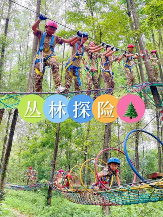 在樱花林掩映的树林间闯关,绳索、吊桥、蹦床,重走长征路等关卡刺激又安全,挑战勇气;爬上爬下、钻洞寻宝,让小朋友尽情撒欢,解放天性。