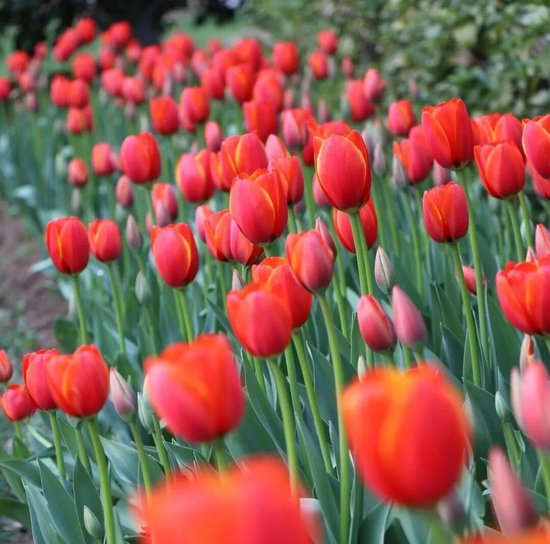 深浅不一的郁金香沿着缓坡铺展