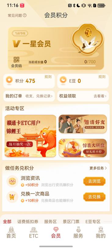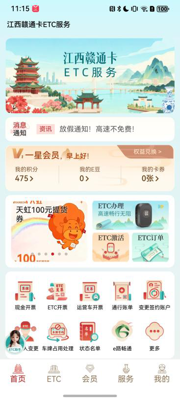 无论您是新车主申领ETC,还是老用户管理设备,鸿蒙版赣通宝均提供便捷服务体验,省时省心;账户充值秒到账、通行账单实时查,资金明细一目了然;更有ETC会员专属权益,会员活动享不停、积分兑换好礼不断!