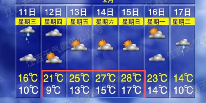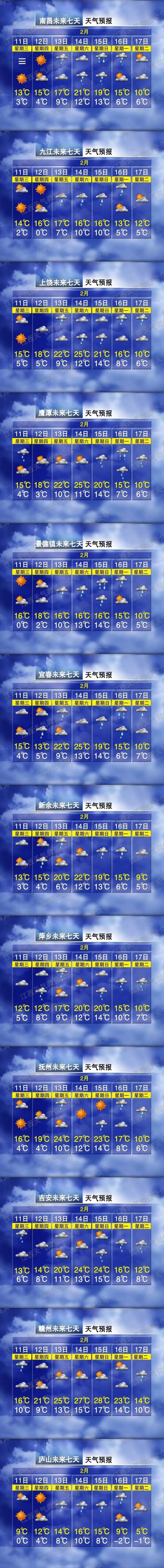 12日—14日白天雨水将再度回归主要集中在赣北地区赣中多云间阴天赣南多云间晴
