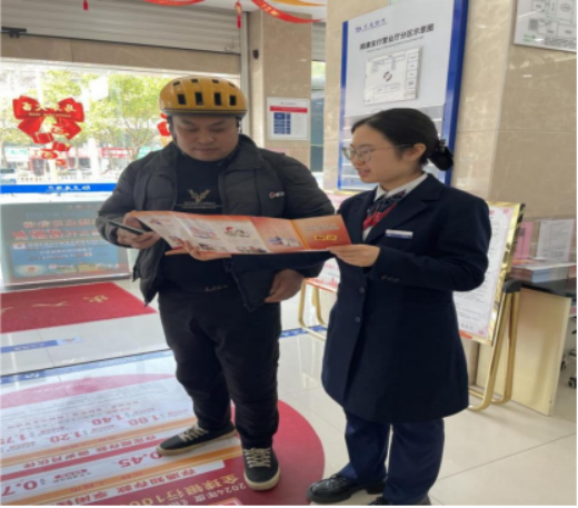 针对户外工作者到店频次高、金融知识相对薄弱、易受网络诈骗侵扰等特点,支行推出 “点对点、面对面” 的靶向宣教服务。厅堂工作人员主动迎上前,为忙碌奔波的外卖骑手、快递小哥等新市民群体开设“消保微沙龙”,围绕安全支付、刷单返利诈骗、非法网贷识别、个人征信保护等高频风险场景,结合真实案例,用通俗易懂的“家常话”讲解金融知识。